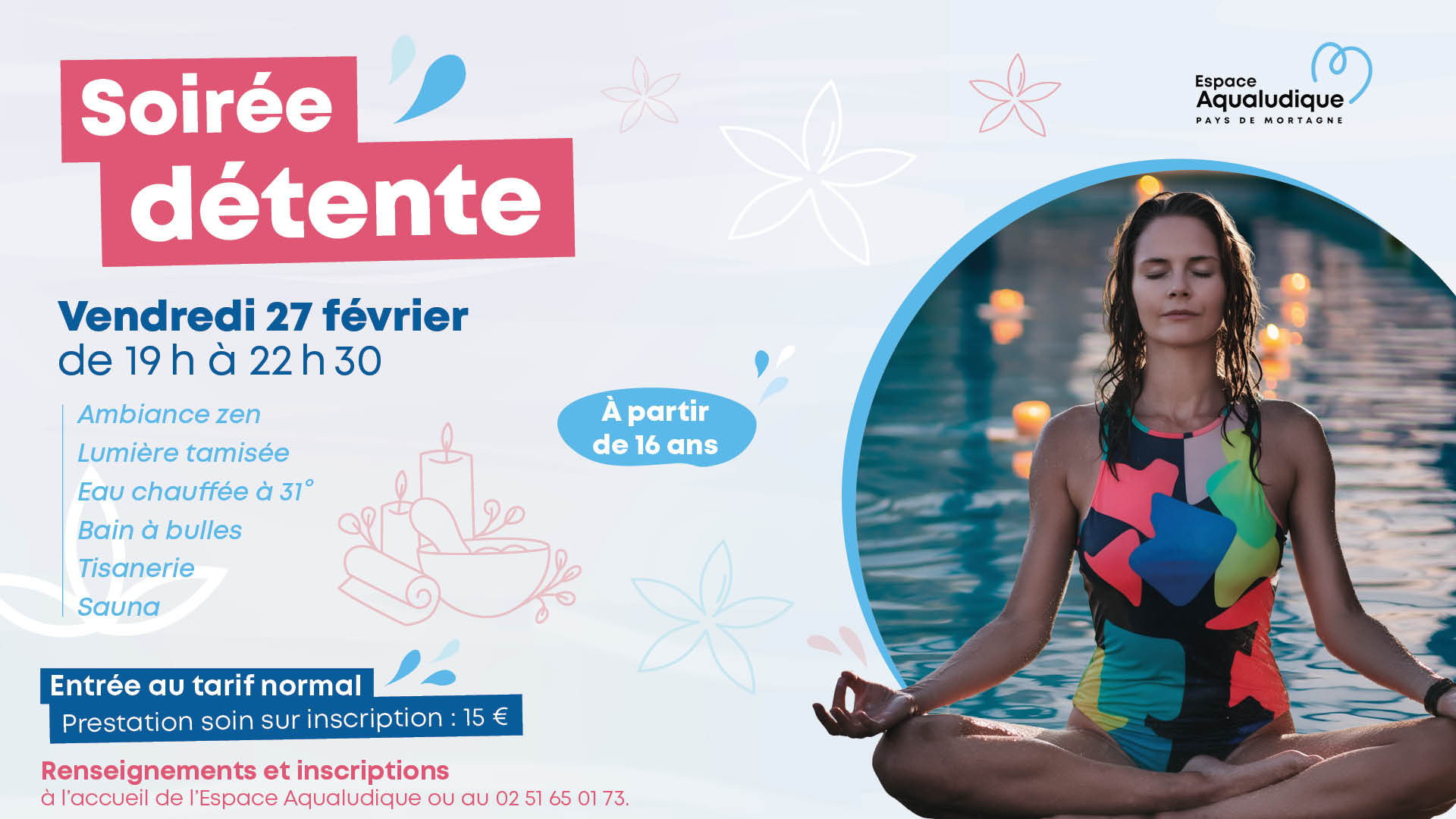 SOIRÉE DÉTENTE L’Espace Aqualudique vous invite à vous inscrire pour sa traditionnelle soirée détente le 27 février ! Au programme de cette soirée relaxation : une ambiance zen, de la musique douce, des lumières tamisées. Profitez entre amis du bain à bulles et du sauna. Vous pouvez aussi, en option,… Read More