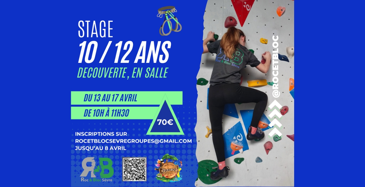 STAGE DÉCOUVERTE DE L’ESCALADE   L’association Roc et Bloc Sèvre propose un stage d’initiation à l’escalade pour les 10-12 ans.   📅 Du lundi 13 au vendredi 17 avril, 🕐 De 10h à 11h30, 📍 Salle d’escalade. 🎫 Tarif : 70€ / Inscription jusqu’au 8 avril. À partir… Read More