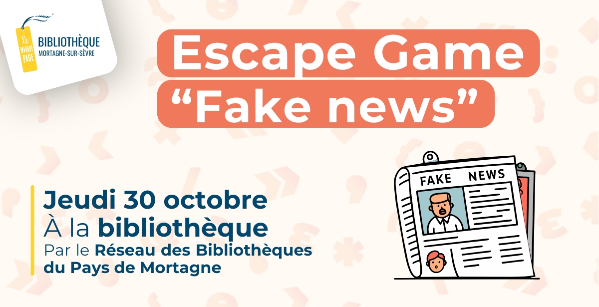 ESCAPE GAME Le réseau des Bibliothèques du Pays de Mortagne organise à la Bibliothèque le Marque-Page deux sessions d’escape Game sur le thème des Fake News. 📅 Le jeudi 30 octobre, 🕐 1ère session à 17h30, 🕐 2ème session à 19h, 📍 Bibliothèque le Marque-Page. 🎫 Gratuit… Read More