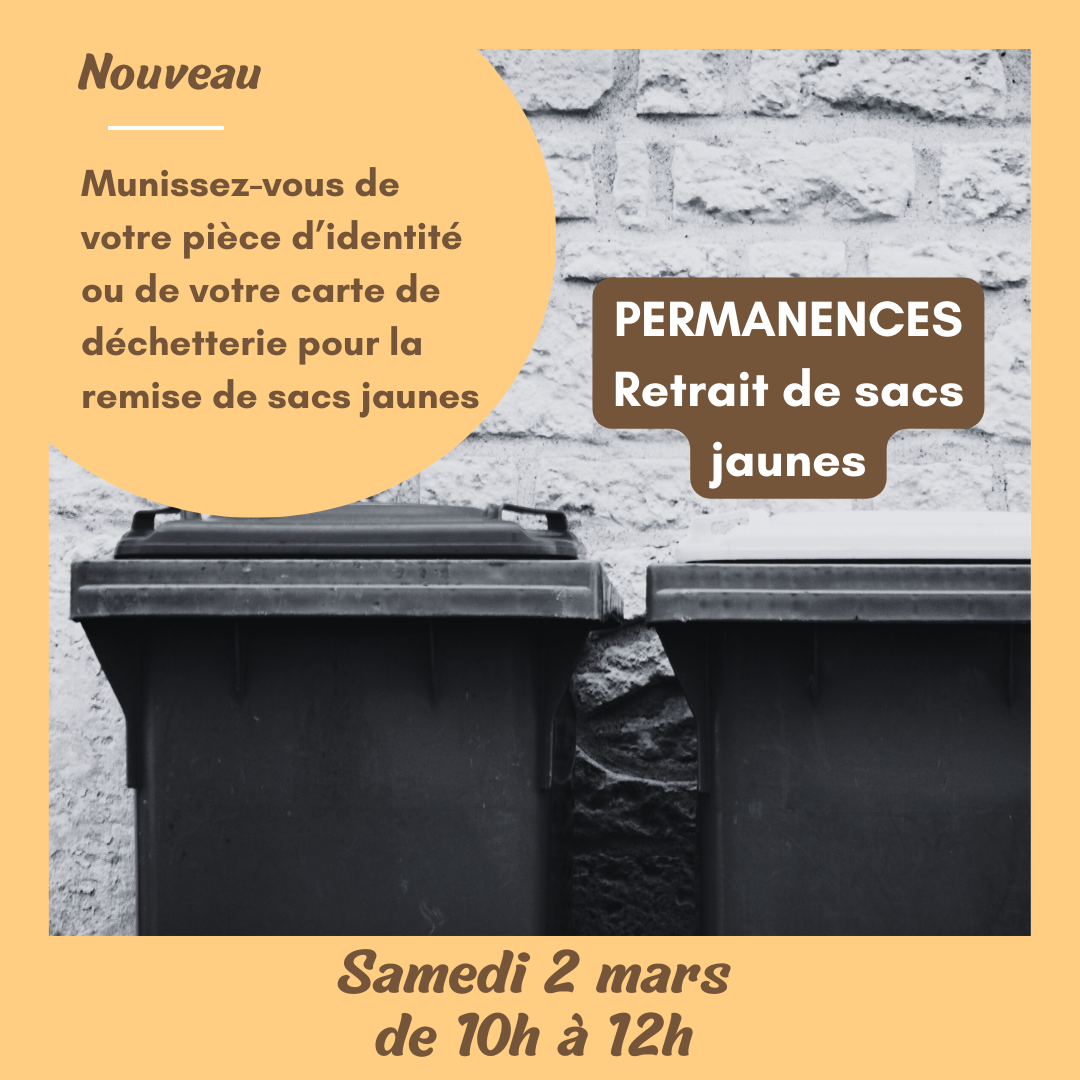 PERMANENCE SACS JAUNES ! Venez récupérer vos sacs jaunes ! Une permanence est prévue ce samedi 2 mars à la mairie de Mortagne-sur-Sèvre de 10h à 12h. Nouveau : merci de vous présenter avec votre pièce d’identité ou… Read More