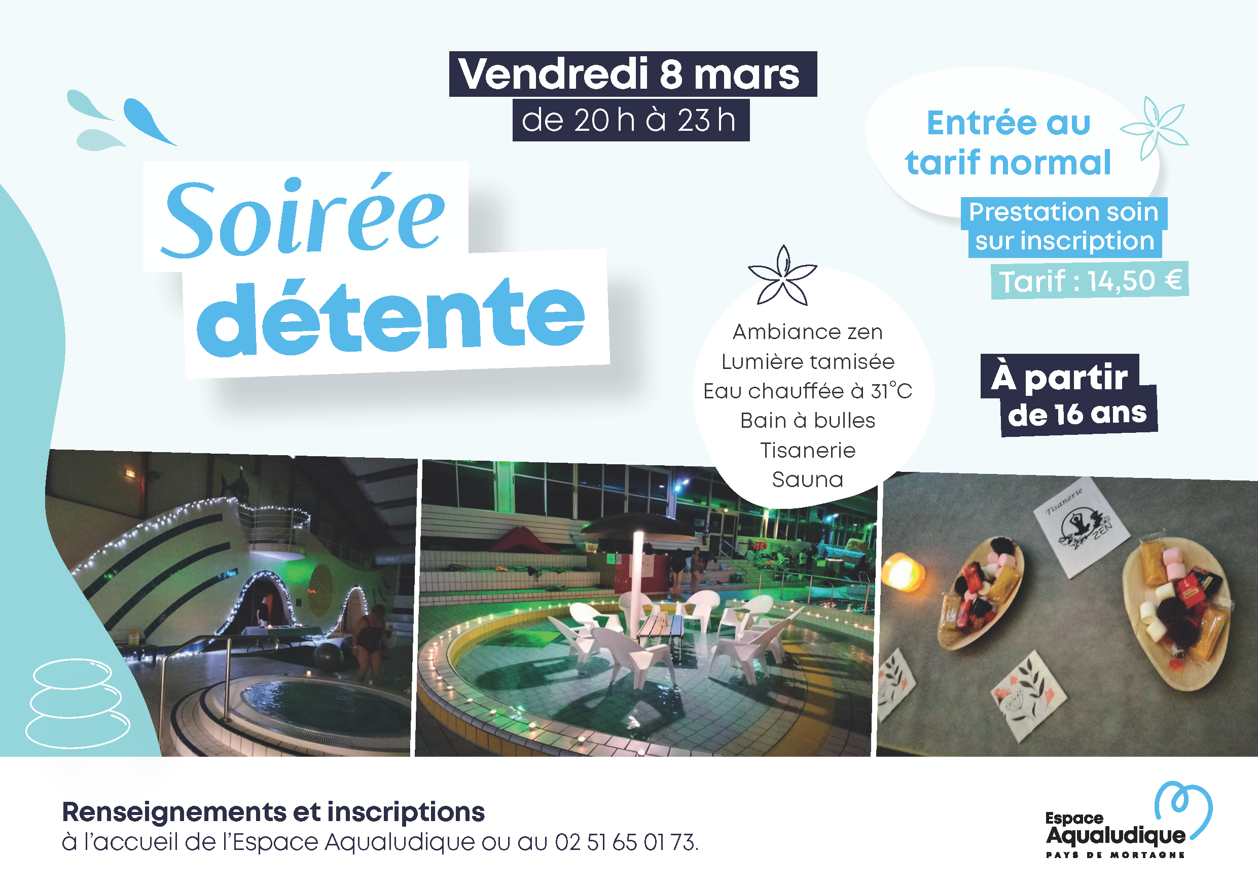 Le vendredi 8 mars, le Pays de Mortagne organise une soirée détente, de 20h à 23h ! Au programme : une ambiance zen, de la musique douce, des lumières tamisées, une tisanerie. Et en option, pour ceux qui le souhaitent, un soin / massage (liste disponible auprès de l’accueil… Read More